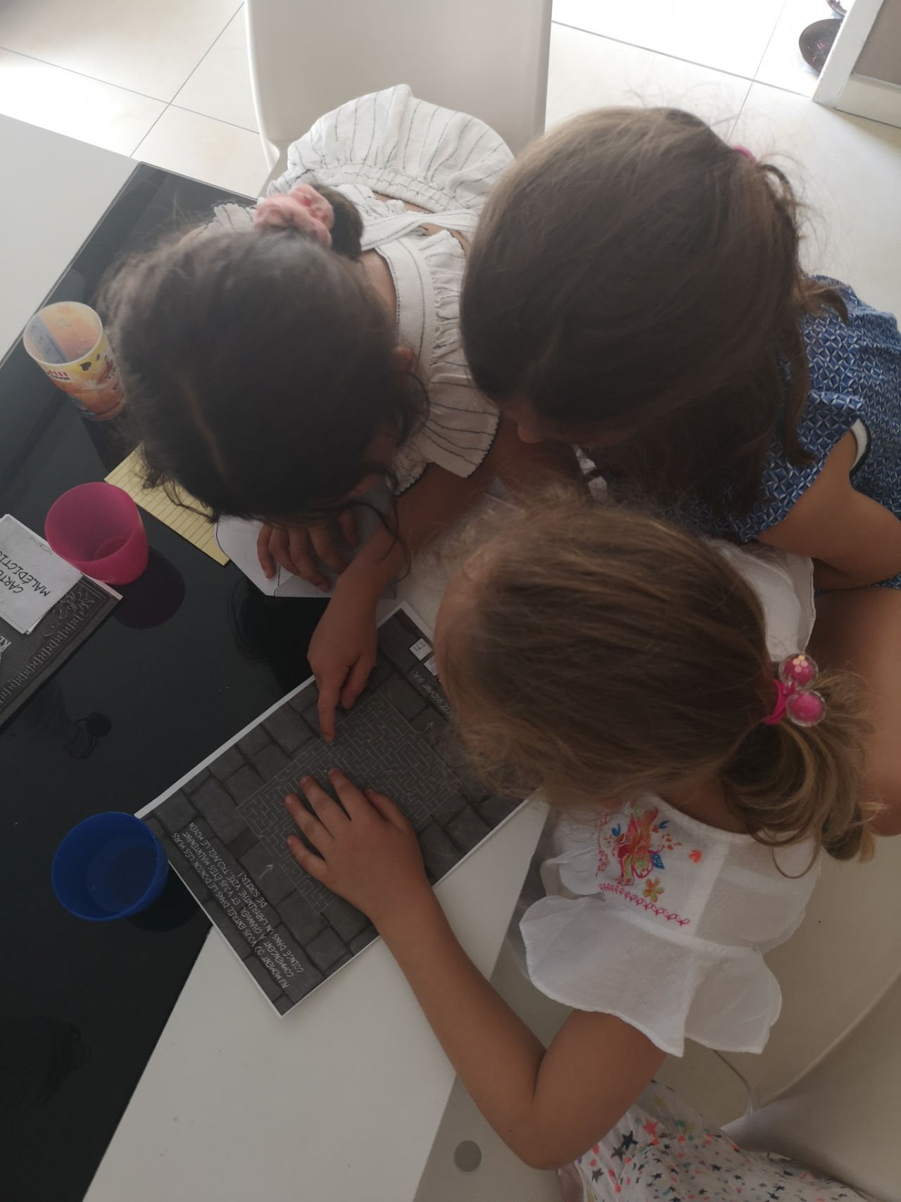 J’ai réparti les énigmes dans chaque pièce de l’appartement, en reprenant le plan de l’école ensorcelée. Un petit écriteau permet d’indiquer la fonction de chaque pièce par rapport aux plan de l’école (mon bureau est devenu la bibliothèque, notre chambre le donjon, etc…). Comme les enfants étaient nombreux, nous avons fait 2 équipes de 5, jouant chacune son tour (pendant ce temps là, l’autre équipe s’entraînait à la slack-line dehors).
